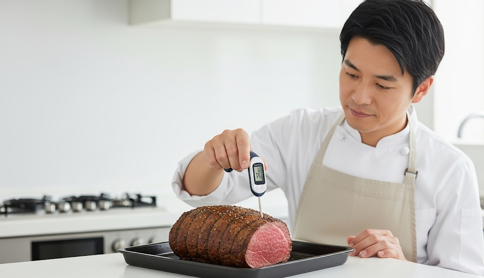 ローストビーフの生焼けの見た目に惑わされず、肉用温度計を使って中心温度を管理することこそ、科学的根拠に基づいた最も信頼できる安全対策と言えるでしょう。