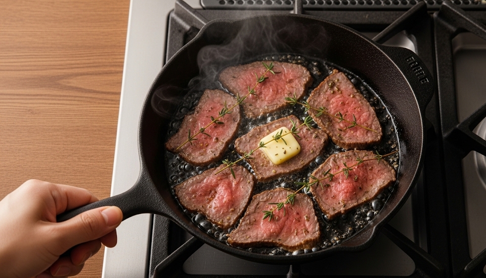 ローストビーフがまだブロックの状態で生焼けに気づいた場合、最も手軽で迅速な再加熱方法がフライパンを使うテクニックです。